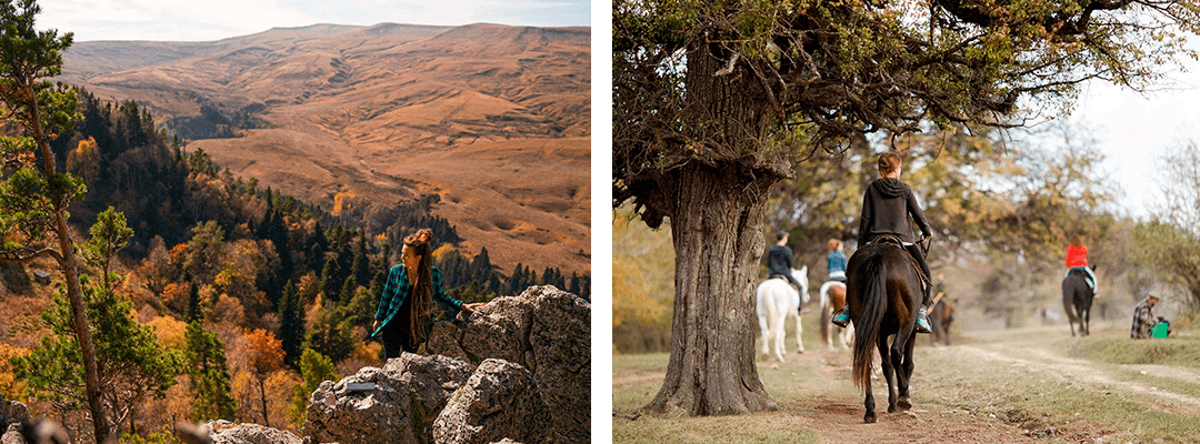 | | | | На очень маленькой территории сконцентрировано множество стоящих и живописных мест: величественные горы Фишт, Оштен и Пшехо-Су, альпийские луга на плато Лагонаки, бурные реки и каскады высоких водопадов, горячие источники… Что из этого вы хотели бы увидеть? Поделитесь, и мы организуем для вас велопрогулки, треккинг, каньонинг, а также дегустацию блюд адыгейской кухни и кулинарные мастер-классы.