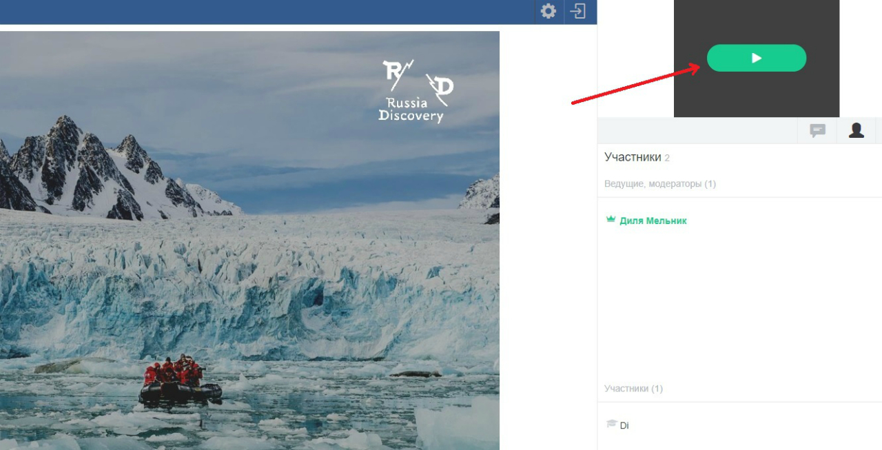 После входа на площадку, пожалуйста, нажмите на кнопку Play на зеленом поле, указанную на фото внизу. Вы начнете видеть и слышать ведущих. | | | | | | Чтобы присоединиться к встрече, нажмите на кнопку внизу. Онлайн-площадка будет доступна за 30 минут до начала. | | | | | Если у вас появились вопросы, напишите их в ответ на это письмо или позвоните по тел. +7 (495) 104-64-36. С любовью к приключениям, команда RussiaDiscovery | | | | Вы получили это письмо, т.к. подписаны на рассылку RussiaDiscovery.
