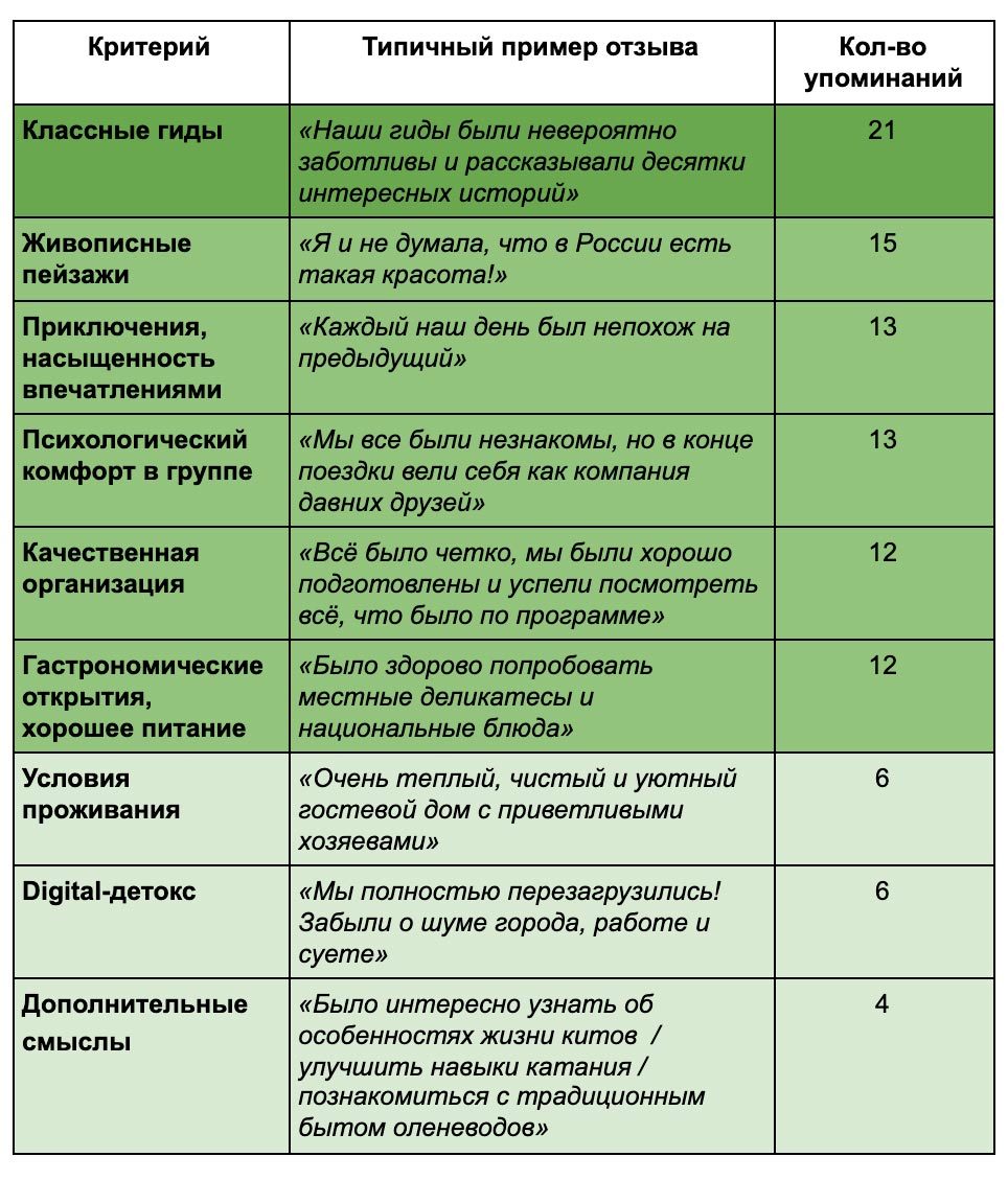 Поехали! 1. Что важно для туристов На этой неделе мы проанализировали отзывы наших туристов по 25 топовым программам. Не просто прочитали, а классифицировали по частоте упоминаемых критериев. Делюсь результатами: | | | | Как видите, в этом рейтинге с большим отрывом лидируют гиды. Хороший гид — 80% успеха тура. Харизматичный рассказчик, профессиональный инструктор, заботливый руководитель группы. Понимаем, что найти или вырастить такого человека непросто. Пожалуйста, напишите в ответном письме, как вы решаете для себя этот вопрос?