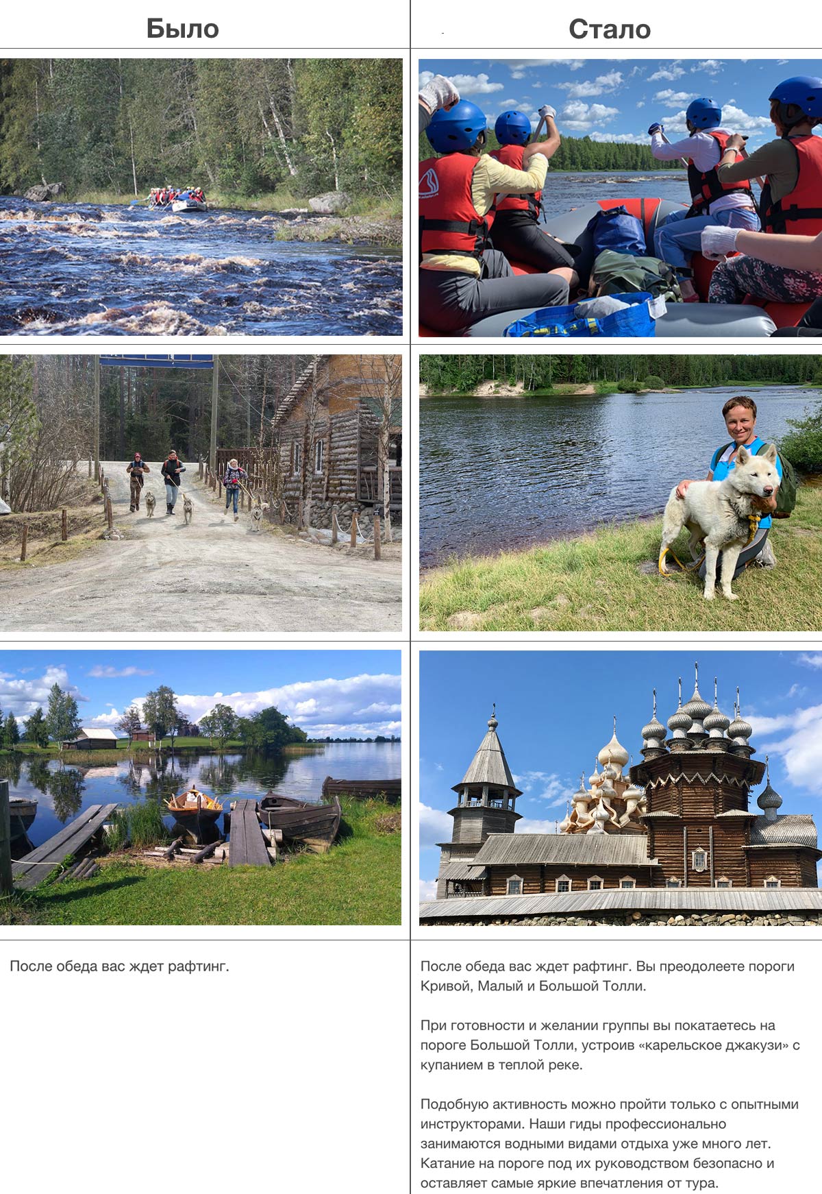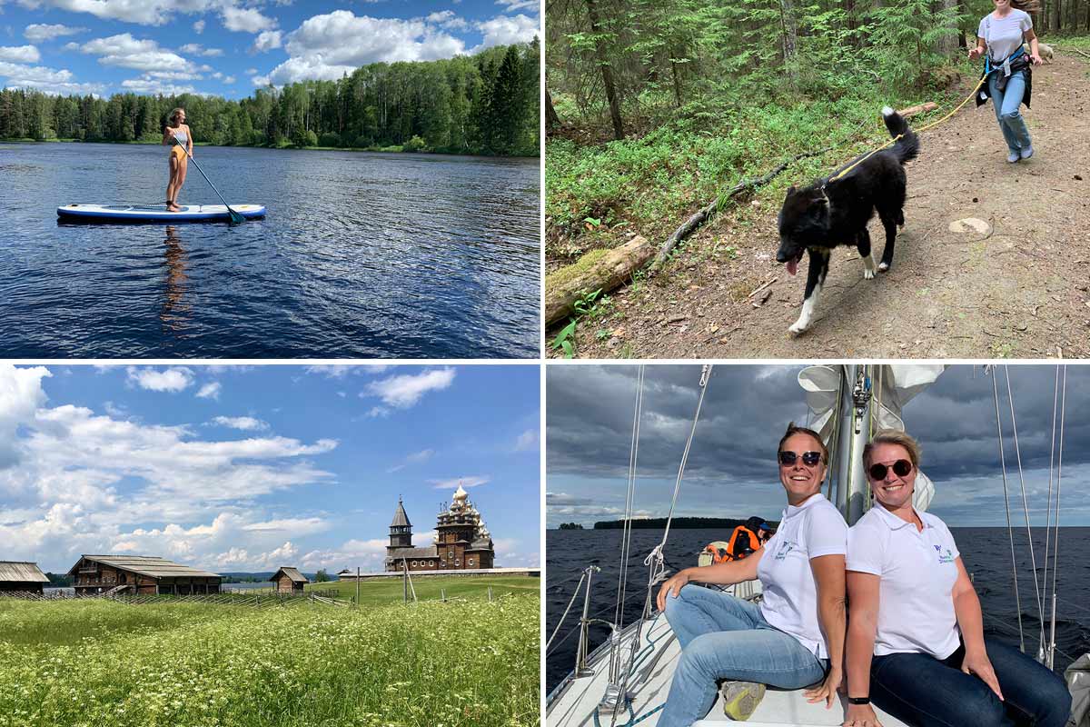 В прошлые выходные мы с коллегами ездили в Карелию, тестировали нашу авторскую программу выходного дня. За 3 дня попробовали 5 видов активного отдыха: велопрогулка, SUP-серфинг, рафтинг, яхтинг и дог-треккинг. Наш маркетолог пропустила велодень, зато успела съездить на Кижи.