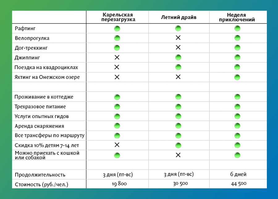 Собрали всё это в наших программах — ловите топ-3 летних путешествия в Карелию: | | | | Не ждите отпуска. Хорошо перезагрузиться можно и за уикенд — в прошлые выходные мы проверили это на себе. В нашем туре всего за 3 дня вы попробуете сразу 4 вида активного отдыха: лесную велопрогулку, SUP-серфинг, рафтинг по Шуе и дог-треккинг (в поход вы отправитесь вместе с пушистыми хаски). Никакой специальной подготовки не нужно — ехать можно с родителями, детьми или друзьями, которые катаются на велосипеде только в парках или на набережных. Еще 2 причины выбрать это путешествие: - Это самая доступная программа для семейных выходных — ее стоимость 19 500 руб./чел.