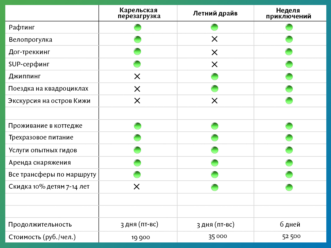 | | | | | | | | Во всех программах: вкусное трехразовое питание, опытные гиды, новейшее снаряжение. И комфортное размещение — вы будете жить в уютных гостевых домах, которые находятся в сосновом лесу недалеко от Петрозаводска. Чтобы было легче сориентироваться, что общего в турах и чем они различаются, смотрите нашу табличку.